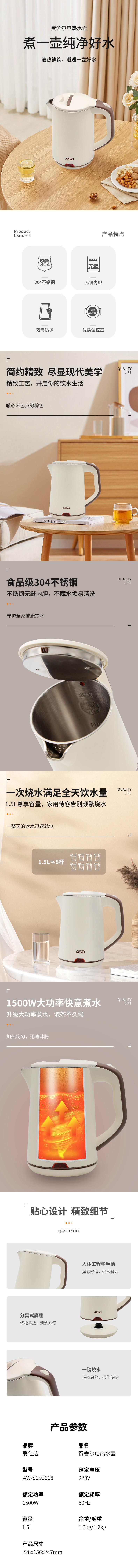 爱仕达(ASD) AW-S15G918 费舍尔电热水壶 1.5L(单位:台)