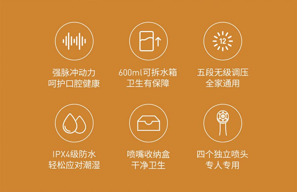 包装尺寸:221*109*188mm; 水箱容积:600ml; 额定功率:24W;电机电压:18V;水管长度:95cm;电力电缆外露长度:120cm;清洁模式:无极调压; 喷头净重:约2.5g;毛重:约830g; 水压:低档:85KPA/(N)~高档:185KPA/(N); 弹冲频率:1400次/分钟;主要材质:ABS;
