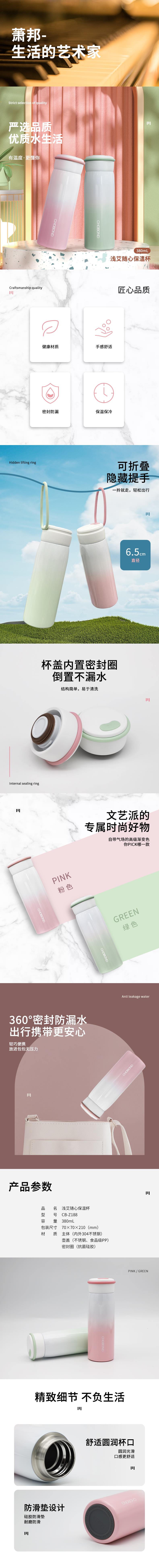 肖邦 CB-Z188 浅艾随心保温杯 380ml (单位: 个)粉色、绿色随机发货